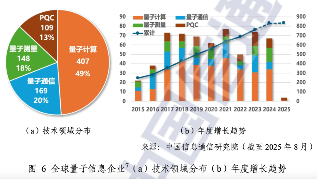 报告显示,全球量子信息相关企业数量突破800家,量子计算领域占主导地位,占比约50%,PQC领域发展迅速,相关企业已突破百家。量子信息企业数量逐年稳定增长,自2017年起进入初创企业快速增长期,在2022年有所回落,但近五年仍保持约60家/年的平均增速,反映出量子信息已成为全球各国发展新兴技术、培育未来产业的重要方向。