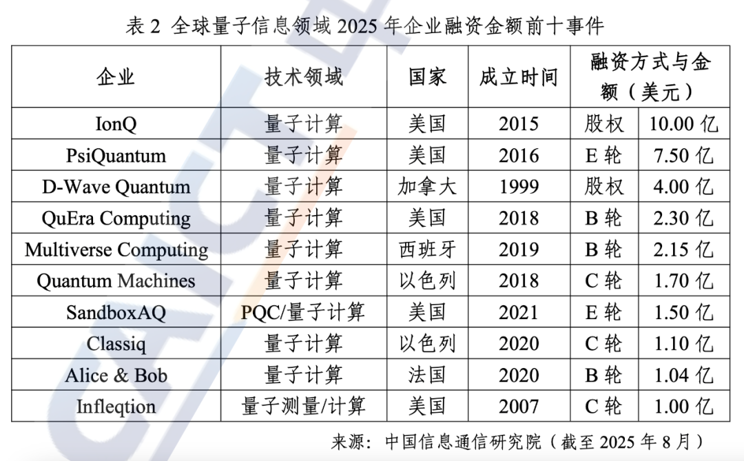 从投融资来看,美国领先地位依然显著。量子计算明星企业已成为资本市场的追捧热点,3月美国PsiQuantum完成7.5亿美元E轮融资,7月IonO完成10亿美元股权融资,成为量子企业单笔融资规模的最高纪录。欧美量子企业在前十融资事件中占据8席,另外2家以色列量子计算企业和欧美生态系统联系紧密。PsiQuantum、SandboxAQ等领军企业已陆续进入风险投资后期轮次,反映出市场对其未来发展前景高度认可。